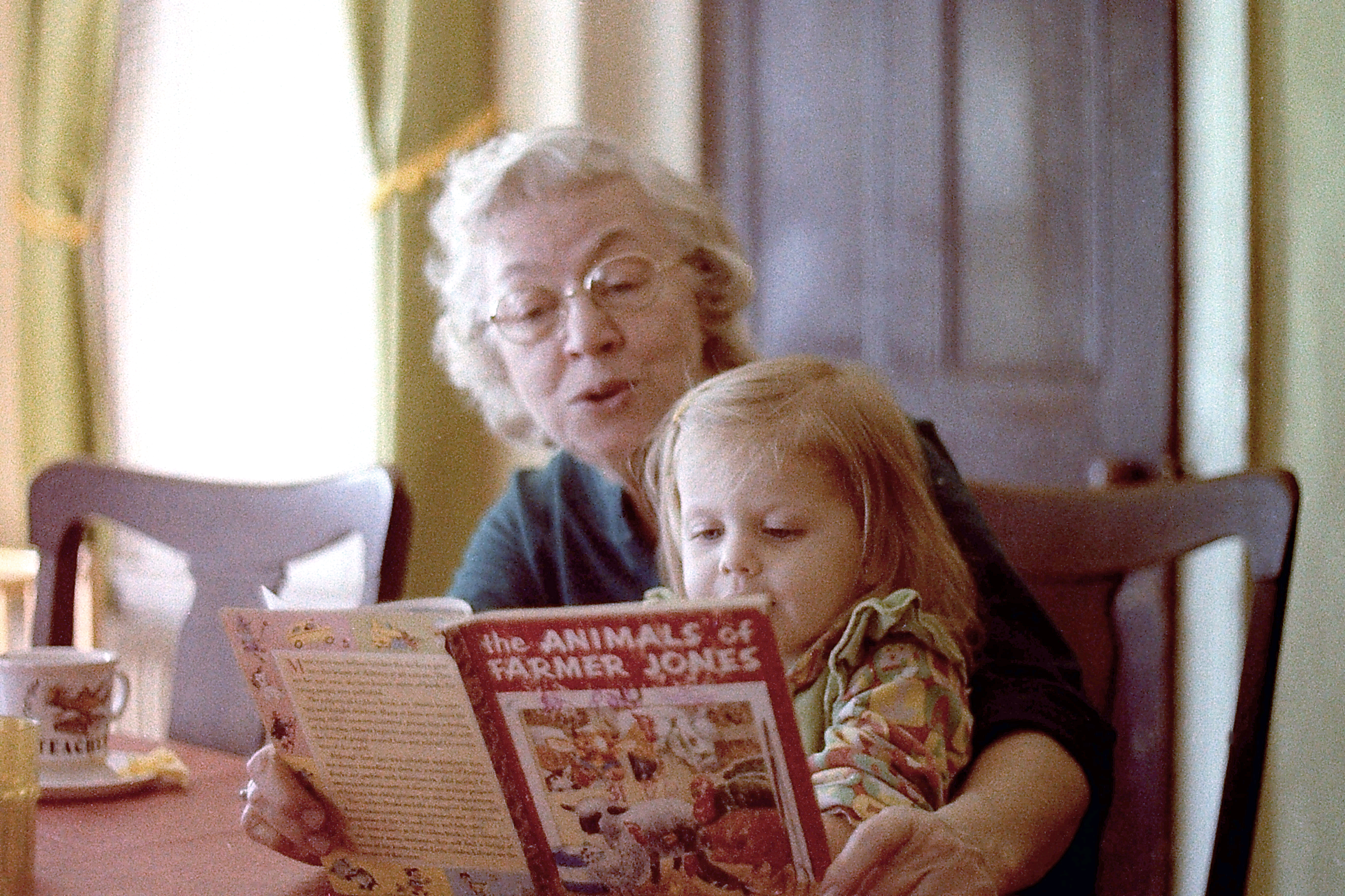 1978 Dawn Elizabeth Deering with her maternal grandmother Ellen Agnes [Dupuis] Martin reading together at Old Main Street, South Windsor, CT "But where is Farmer Jones?"